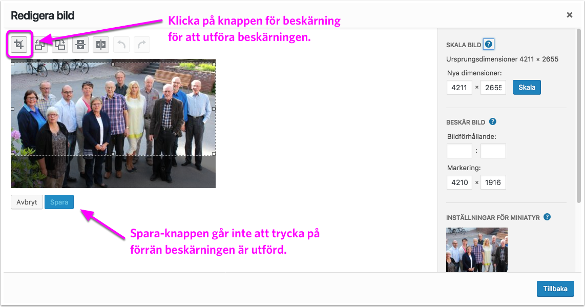 När man är nöjd med beskärningen och vill spara den kan det verka förvirrande att knappen Spara inte går att klicka på. Det beror på att man först måste trycka på beskärningsknappen ovanför bilden, för att utföra själva beskärningen.